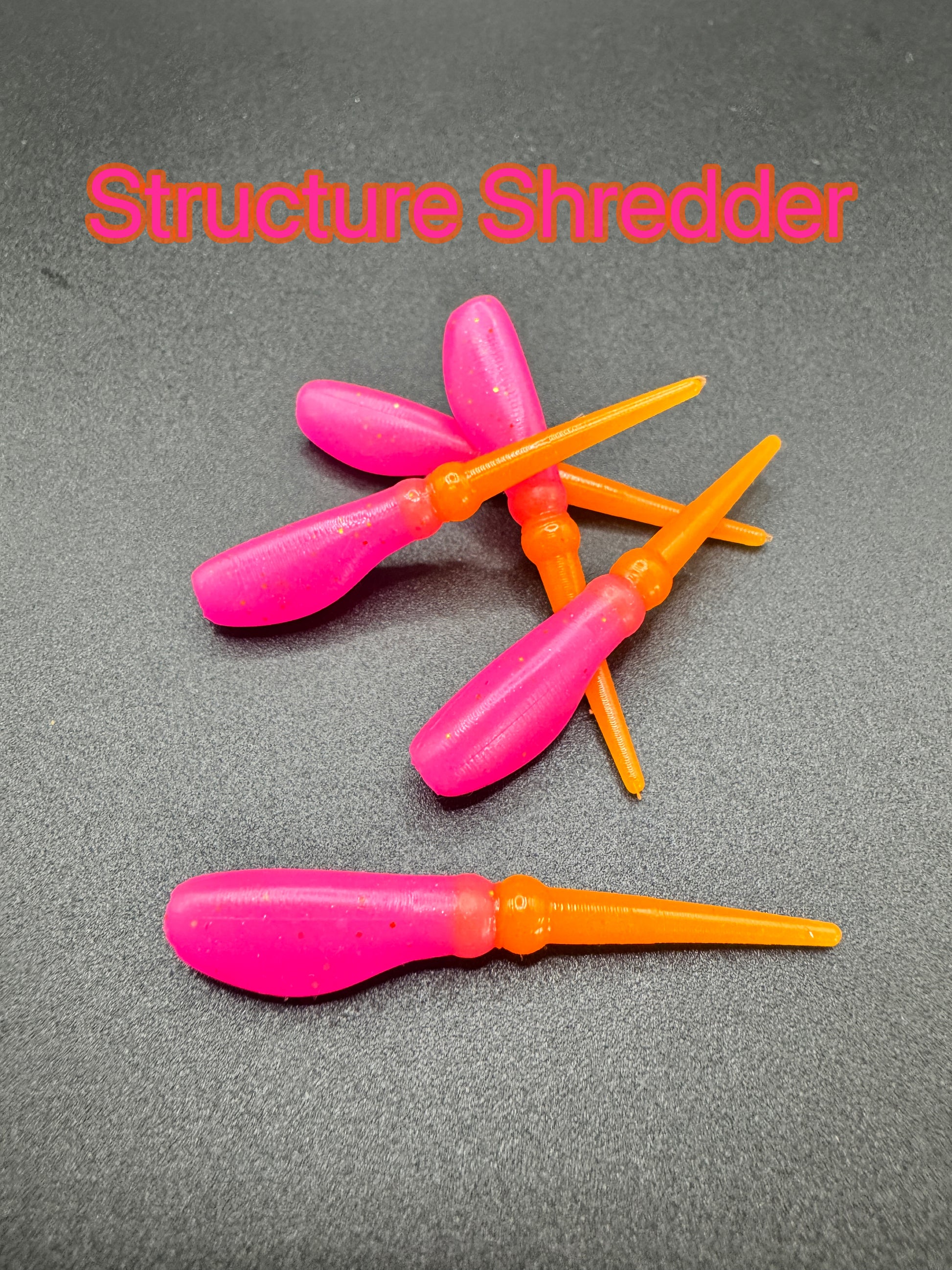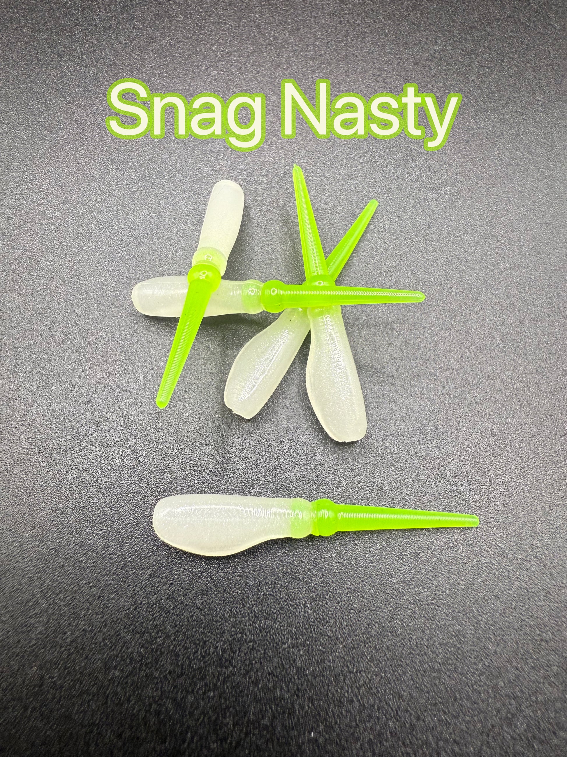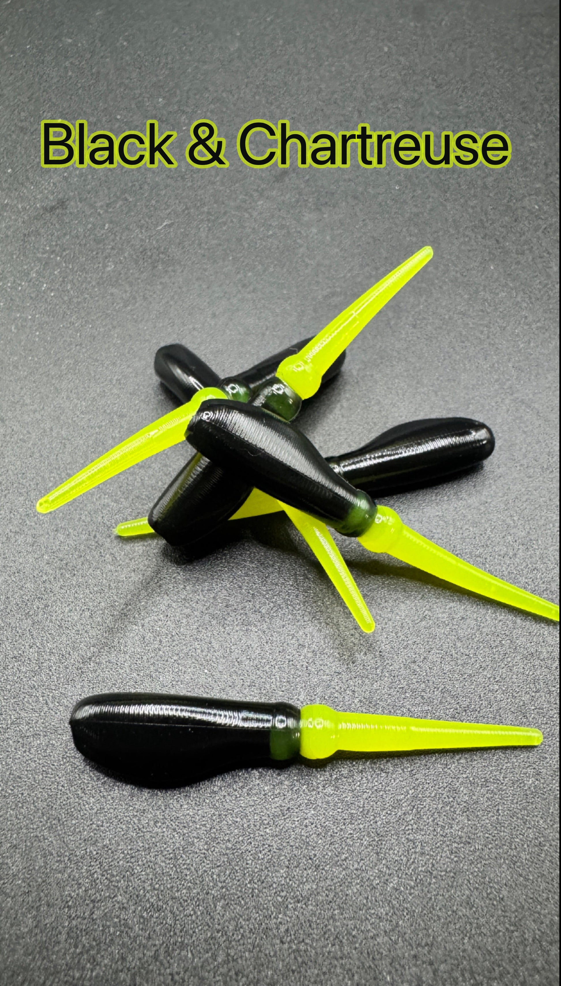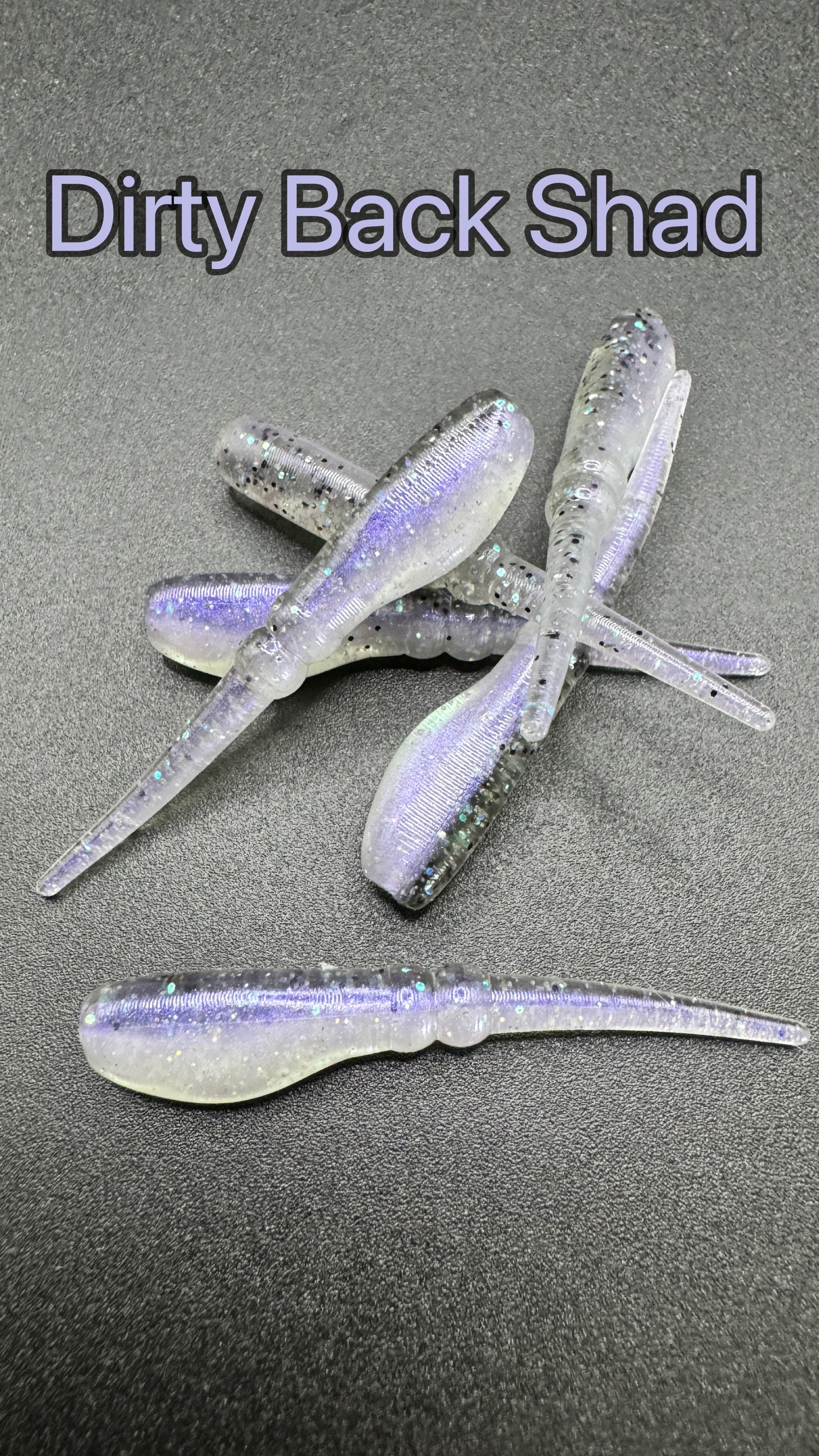 The heavy hitter. The 2” Slab Snack delivers a bold presence with a fatter ribbed body and a wide thumping tail that slabs can’t resist. Designed for stained water, deeper brush piles, and aggressive fish, this bait shows up strong on LiveScope and hits even harder on the hook set.
